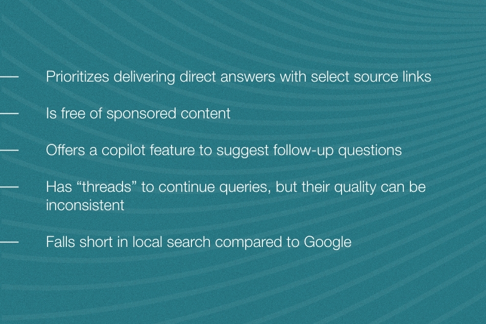 Perplexity aims to streamline the user experience by synthesizing a single answer. It shows its work by offering a handful of sources with the generated answer. For now, the quality of its answers is inconsistent. At its best, Perplexity can be a time-saver for users learning a new topic.
